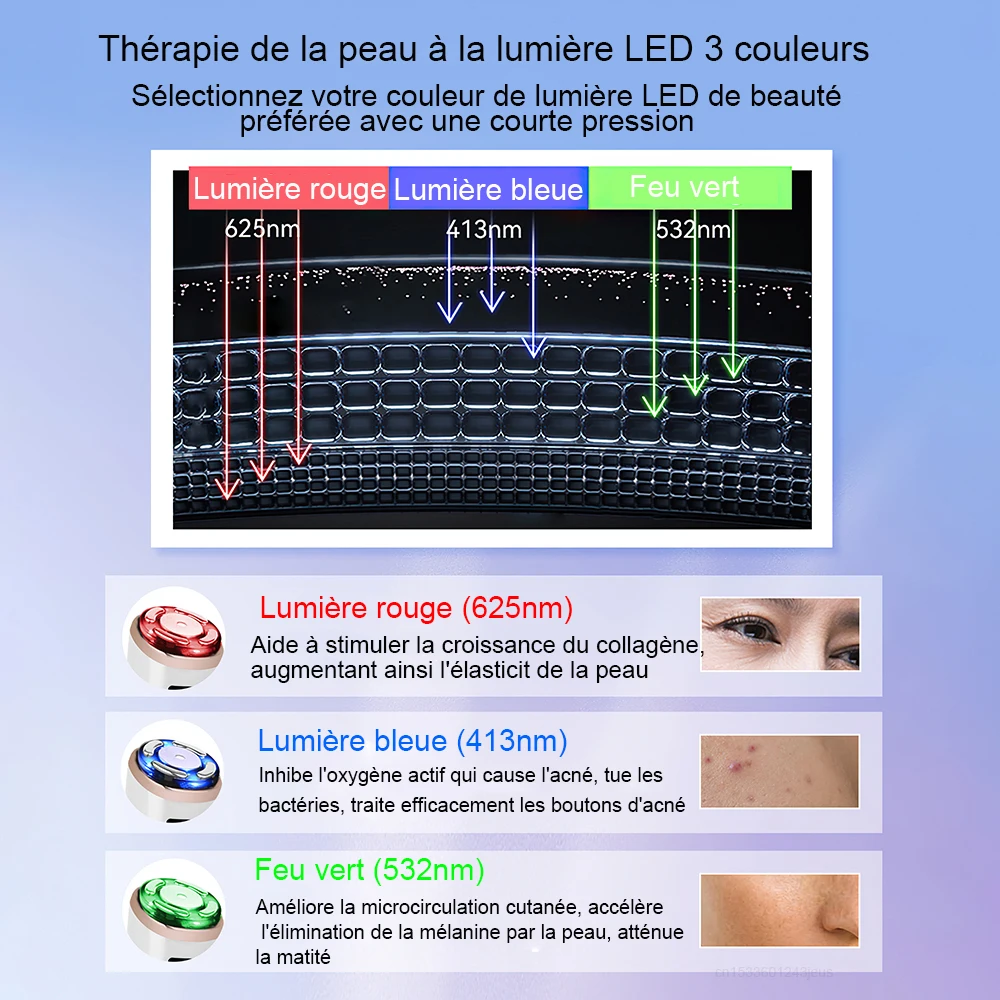 Il offre trois modes de LED différents – Bleu, Rouge et Vert – chacun ayant des propriétés spécifiques pour divers besoins de soin de la peau.